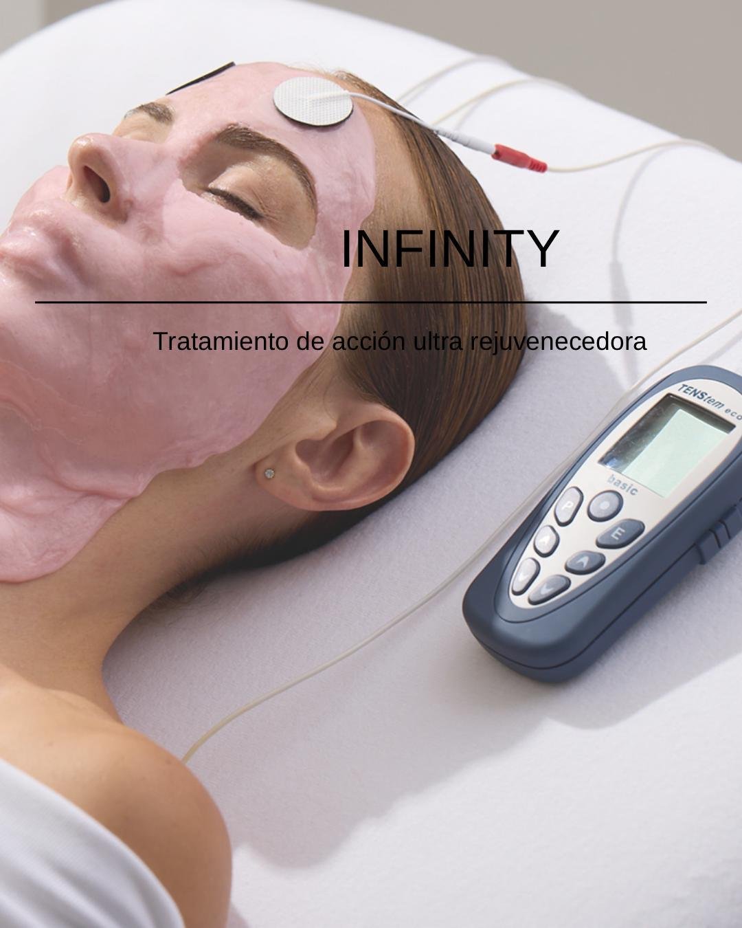 Tratamiento de acción ultra rejuvenecedora. El tratamiento profesional Infinity con acción ultra rejuvenecedora es la revolución antiedad para pieles maduras. Sus componente de cosmética inteligente protegen la degradación del ADN, prolongando la vida de los tejidos dérmicos. Con triple acción antiedad, reafirma y combate la flacidez, reduce arrugas y líneas de expresión y mejora la textura de la piel. El tratamiento Infinity es perfecto para clientes que desean un tratamiento antiedad potenciador de la piel, porque mejora el ciclo regenerador natural de la dermis, fortaleciendo sus capacidades regeneradoras, reparadoras y energéticas. Una fórmula única que suaviza las contracciones faciales involuntarias provocadas por el estrés crónico de la piel, reduciendo así la aparición de líneas de expresión.